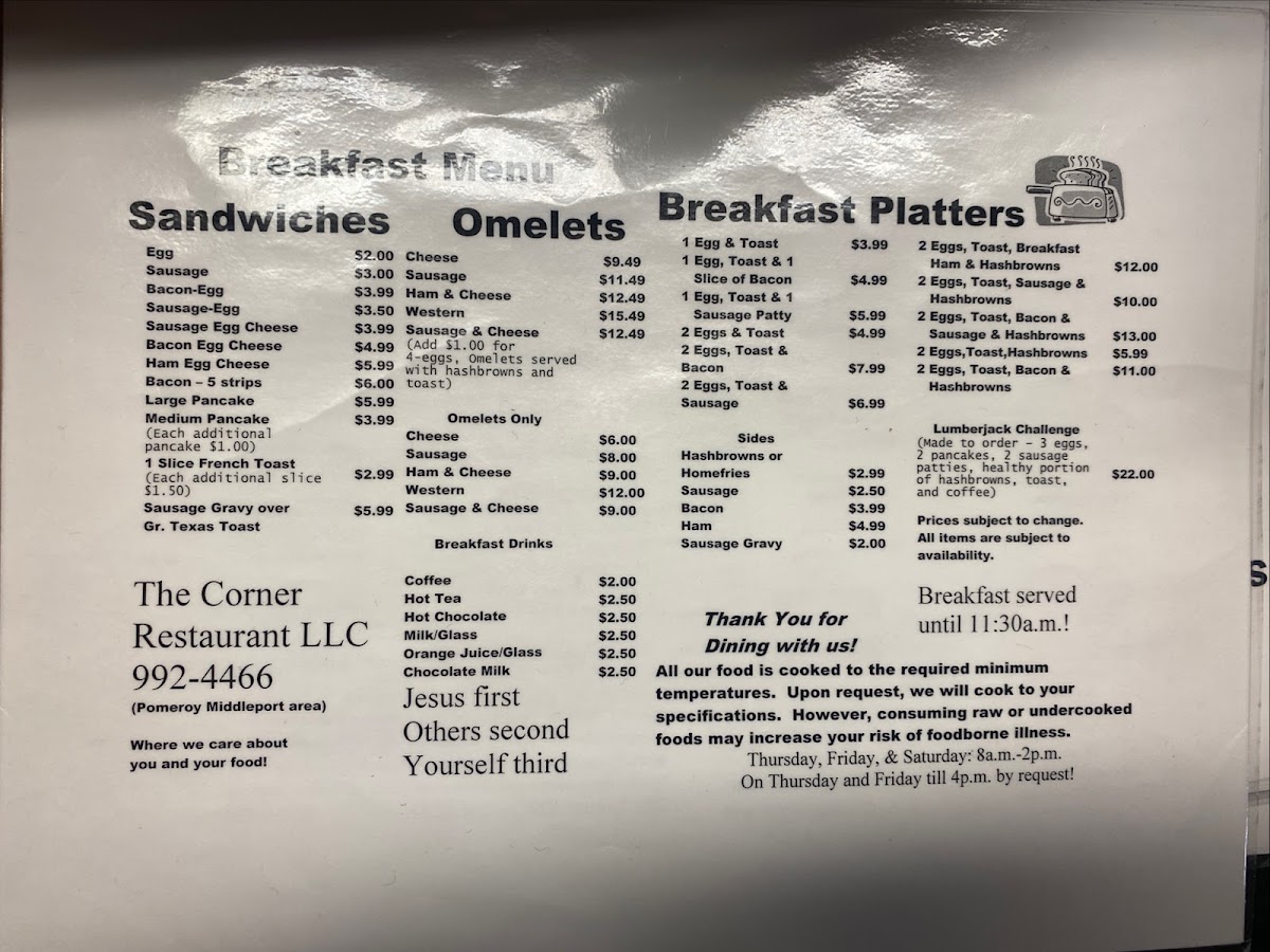 Welcome to Corner Restaurants LLC, a beloved American eatery nestled in the heart of Middleport, OH. With its warm, inviting atmosphere and a menu that boasts generous portions, this local gem brings comfort food to a whole new level. Breakfast aficionados will revel in the variety of omelets, from classic Cheese to the hearty Lumberjack Challenge. The lunch offerings, particularly the smoked meats available Thursday through Saturday, have garnered rave reviews, ensuring that every bite is a delightful discovery.